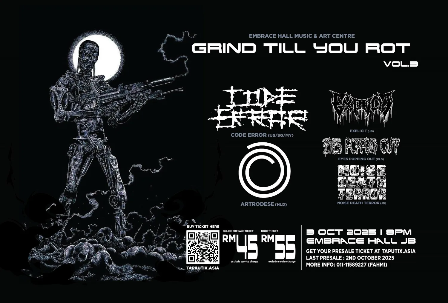 Embrace Hall Music & Art Centre presents GRIND TILL YOU ROT VOL. 3 — Johor Bahru’s underground gathering of pure sonic chaos, happening Friday, October 3rd, 2026. Brace yourself for Code Error, featuring members of Siege (US), Wormrot (SG) and Tools of The Trade (MY), delivering relentless grindcore fury; Artrodese from Holland with an experimental one-man drum & bass assault; local legends The Explicit bringing JB’s punk grind fire; Eyes Popping Out blasting oldschool grindcore from Kluang; and Noise Death Terror representing Johor Bahru’s new wave of raw, youthful rage. This is not just another gig — it’s war.