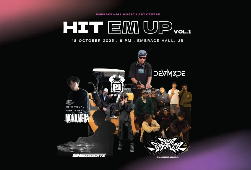 Embrace Hall presents HIT EM UP Vol. 1, happening Saturday night, October 18th in Johor Bahru. The floor will shake, the lights will stay low, and the sound will be unapologetic. With no sponsors and no gimmicks, only raw sets and heavy frequencies, Devmxde, P+L, and 96000HZ take the decks while Clubbermuda delivers hip hop in its purest form, fire and flow without polish. Visuals by Monameqa complete a night of raw energy and unfiltered expression.