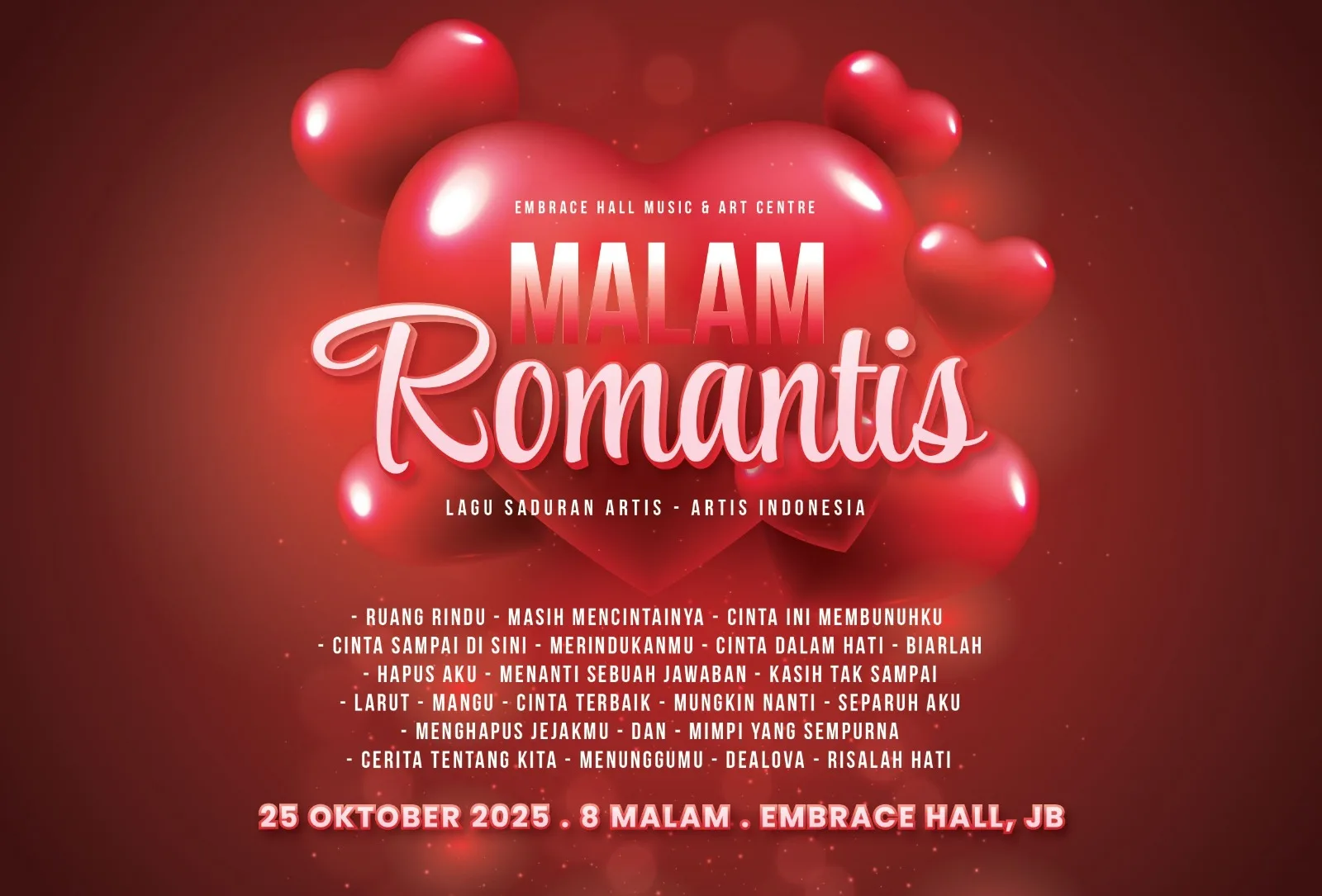 Embrace Hall Music & Art Centre mempersembahkan Malam Romantis, sebuah malam istimewa yang dipenuhi alunan lagu-lagu saduran artis Indonesia yang pernah menyentuh jiwa kita semua. Bayangkan suasana penuh cahaya lembut, dengan lagu cinta yang menemani hati sunyi dan membawa kembali memori yang pernah hadir. Antara lagu yang bakal dipersembahkan termasuk Ruang Rindu, Masih Mencintainya, Cinta Ini Membunuhku, Kasih Tak Sampai, Mimpi Yang Sempurna, serta banyak lagi karya indah yang pernah kita hayati bersama. Malam ini menjadi ruang untuk mengimbau kenangan, merasai semula cinta, dan hanyut dalam muzik yang menyentuh rasa.