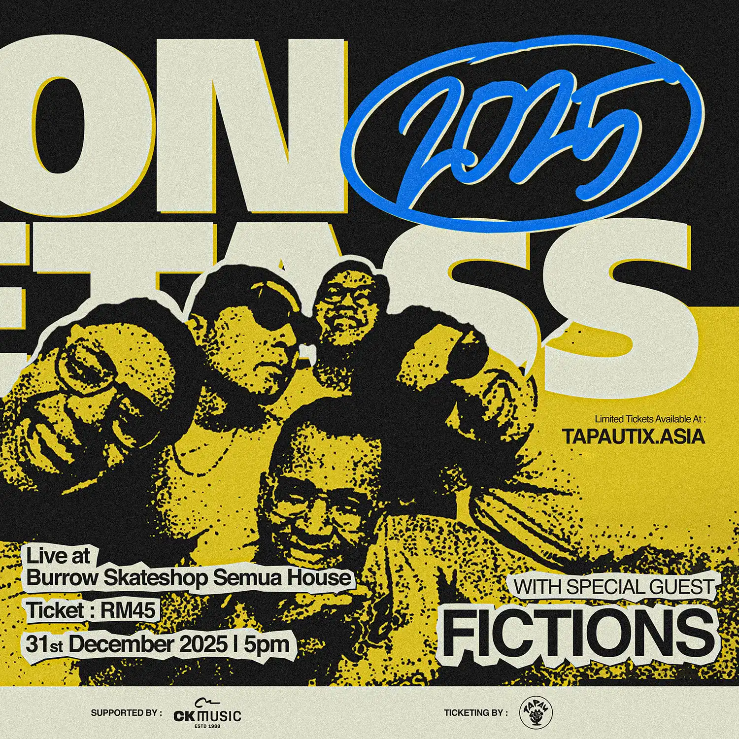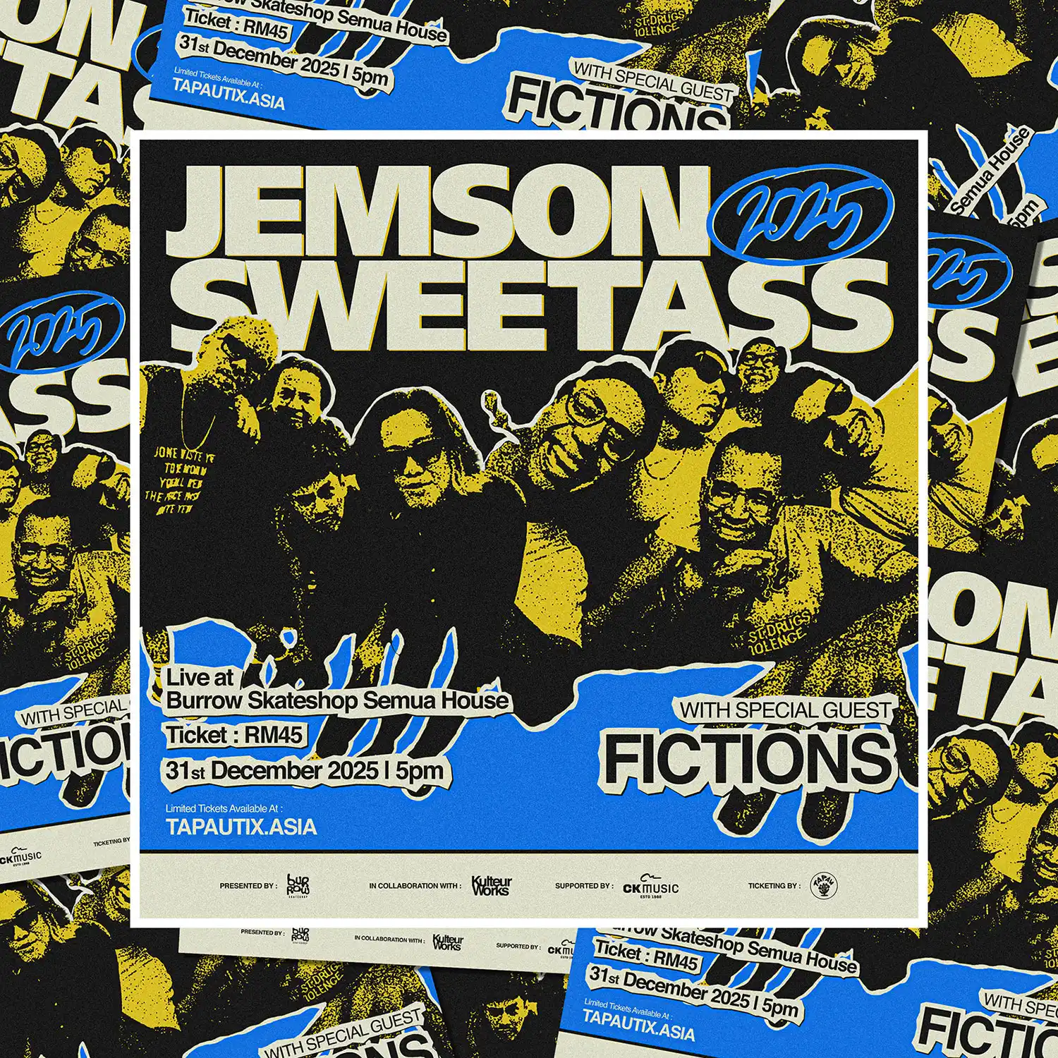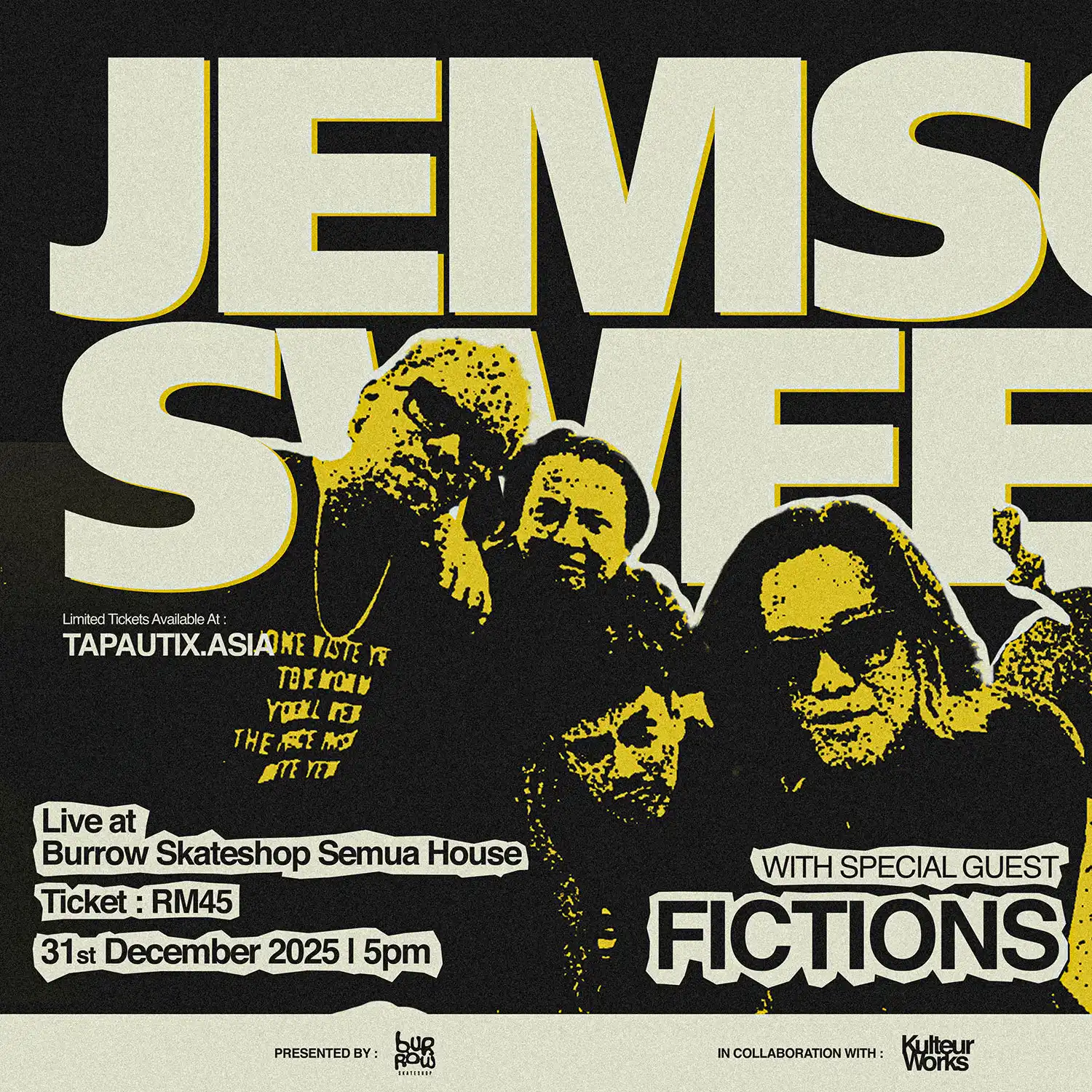 Ring in the new year with JEMSON SWEETASS (NEW YEAR’S EVE 2025) — the wildest rock show in town! 🎸🔥 Happening on 31 December 2025 (Wednesday) at Burrow Skateshop Semua House, Kuala Lumpur, this explosive night of rock energy will take over from 5.00 pm to 10.00 pm. Secure your Early Bird tickets for only RM45 (limited)— excluding platform and payment gateway fees. Don’t miss this high-voltage celebration of music and mayhem, proudly brought to you by Kulteur Works.